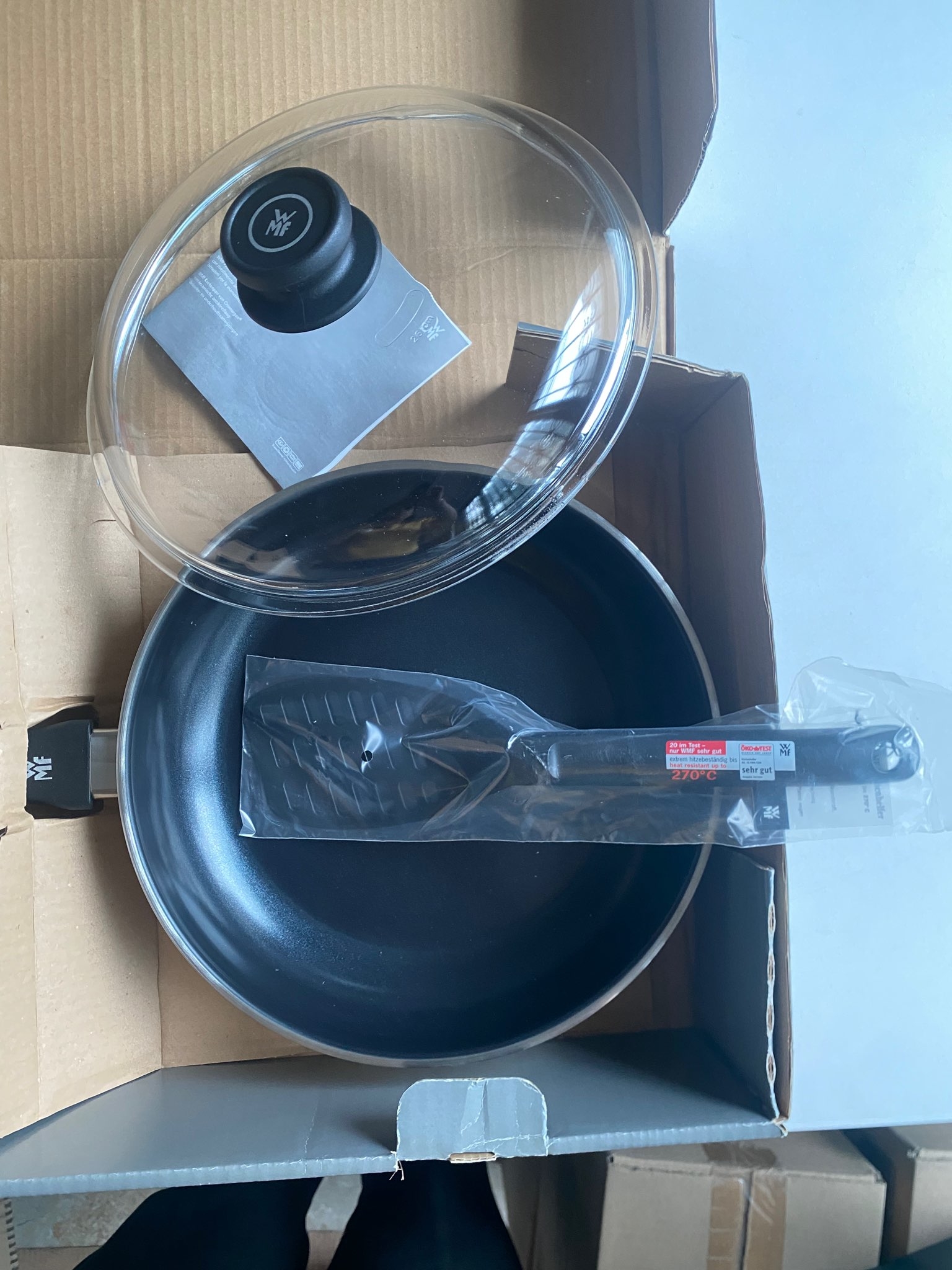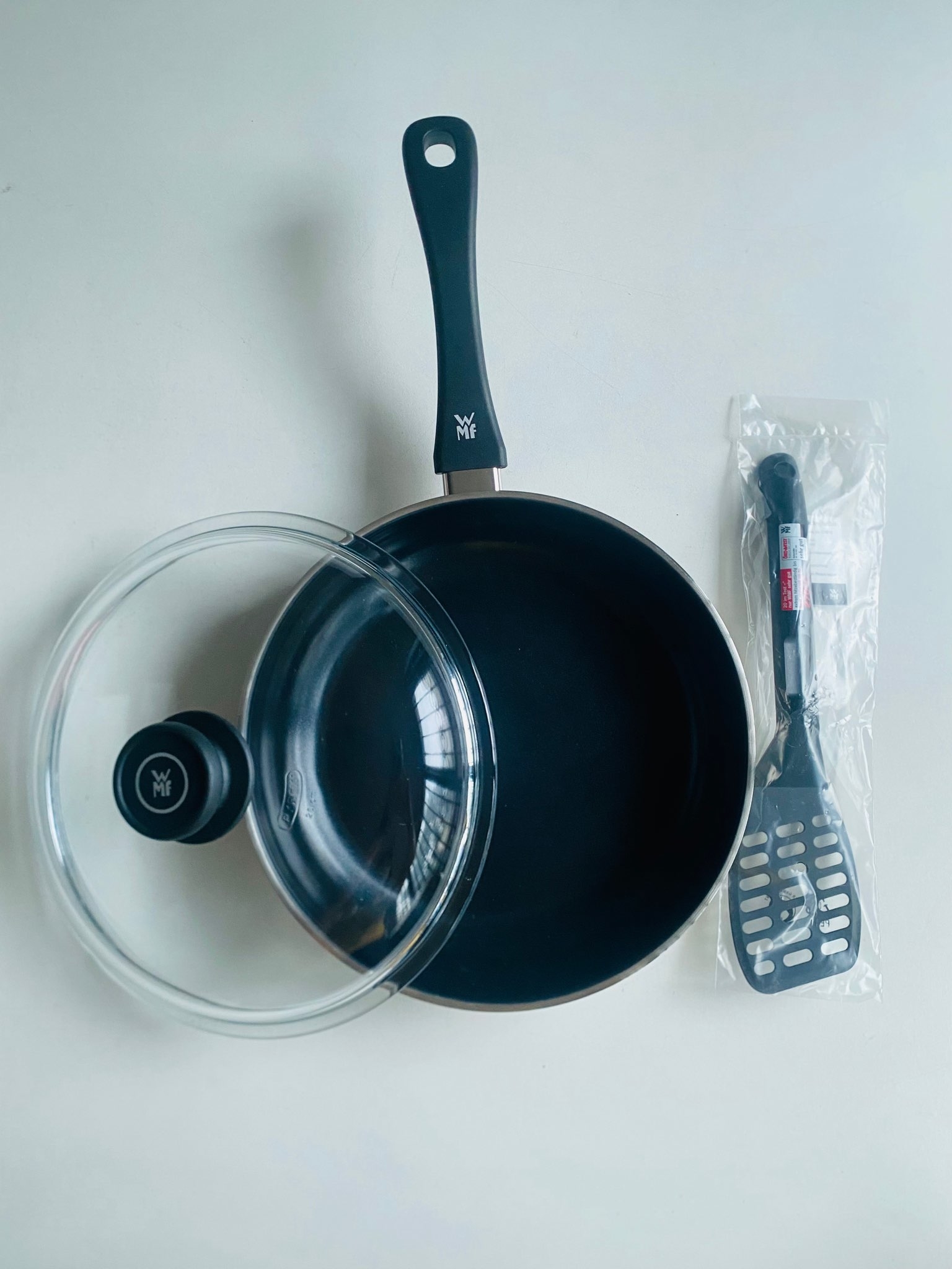 Chảo có vung WMF 26cm - Pfannenset 3TLG 26cm bằng thép không gỉ cùng dụng cụ xào nấu dùng được trên mọi loại bếp